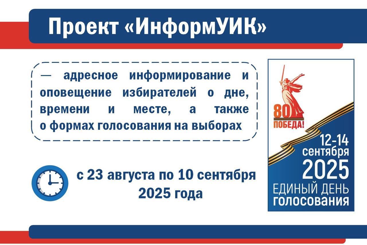 Проект «ИнформУИК» — это проведение адресного информирования и оповещения избирателей о дне, времени и месте, а также о формах голосования на выборах, в том числе с использованием специального мобильного приложения.