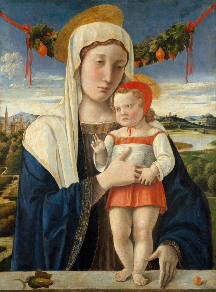 Лик Богородицы с благородными чертами исполнен тихой задумчивости и нежности, взгляд опущен вниз — возможно, на Младенца, а возможно, вглубь собственных мыслей. Христос стоит на парапете, его рука замерла в жесте благословения. За спинами святых разворачивается потрясающий пейзаж: далёкие горы, величественный замок, речные изгибы и застеленное облаками небо.