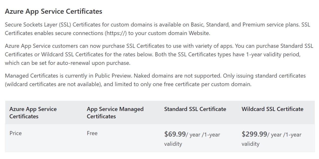 В Azure можна використовувати безкоштовний managed сертифікат (App Service Managed Certificate) для custom domain