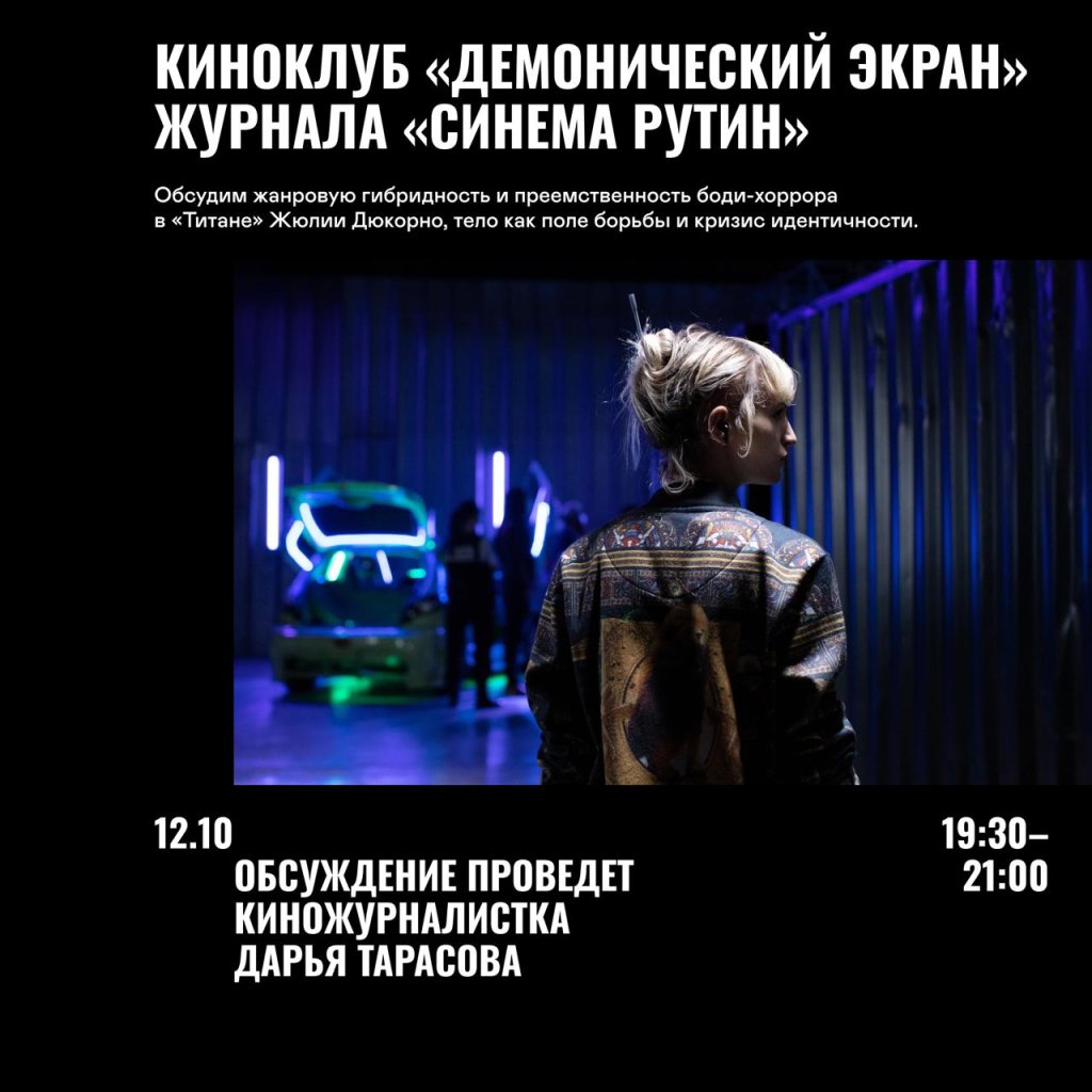 Ближайшая встреча будет посвящена картине Жюлии Дюкорно «Титан» — лауреату «Золотой пальмовой ветви» Канн, изучающему телесность и кризис идентичности. Поговорим о жанровой гибридности фильма, о теле как поле борьбы, о кризисе идентичности и гендерной текучести, и, наконец, о том, как Дюкорно, наследуя традиции боди-хоррора, предлагает радикально современный взгляд на любовь, насилие и тело.