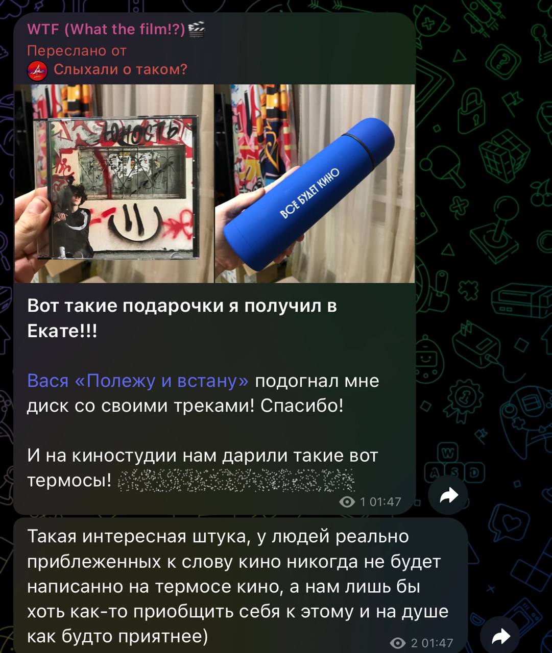 Этот термос считай мерч киностудии. Типо «Люди реально приближенные к слову кино» отказались бы от халявного термоса? Или выкинули бы его и написали об этом в свой тг канал какие они «Приближённые к слову кино»?