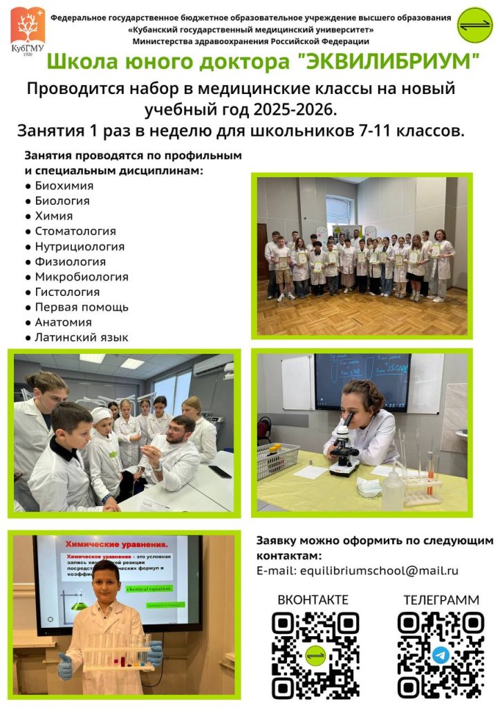Школа юного доктора «ЭКВИЛИБРИУМ» объявляет набор на новый учебный год 2025-26. Для поступления в школу необходимо заполнить ниже предложенную анкету, отправить ее на почту equilibriumschool@mail.ru и пройти собеседование (дата будет указана позже)