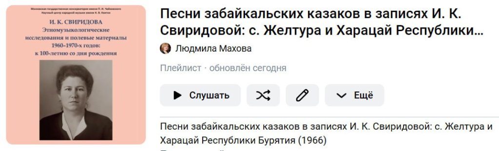 ВКонтакте плейлист песен забайкальских казаков в записях И. К. Свиридовой: с. Желутра Джидинского района и с. Харайцай Закаменского района Республики Бурятия (1966 год).