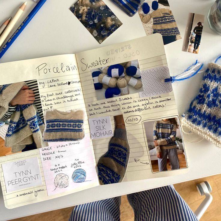 — Вклеивать туда этикетку от пряжи, сами ниточки, референсы изделия, фотографии готовой работы. Записывать свои впечатления от процесса, пряжи и самого изделия 🍁