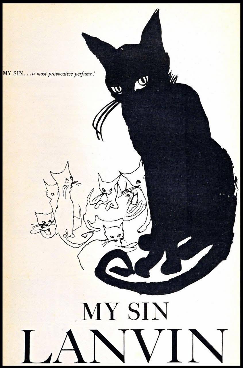 А вот вам котики, винтажные котики Lanvin в рекламе духов My Sin (вернее, уже антикварные котики), 1920-е гг. Ничего в этом мире не меняется — котики всегда двигали коммерцию!