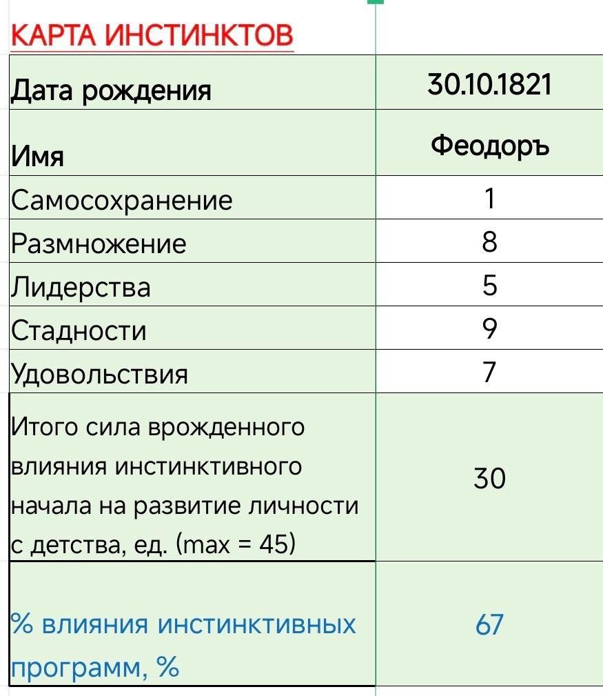 Расчет карты инстинктов Федора (Феодоръ) Достоевского на дор...