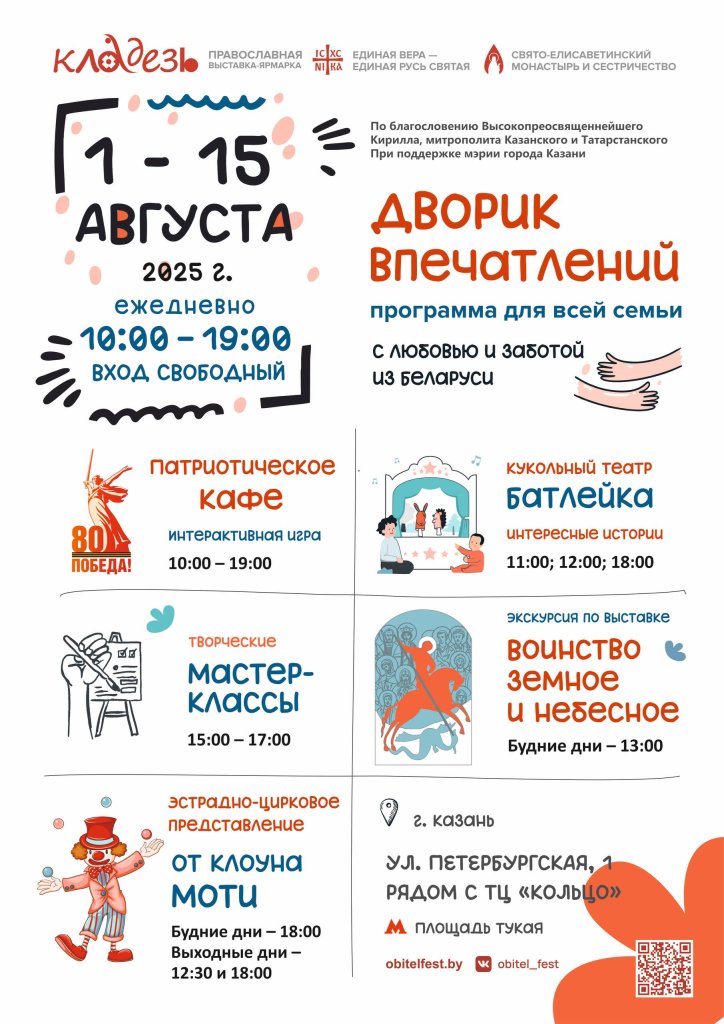 🗓️ С 1 по 15 августа в столице Татарстана пройдет фестиваль православной культуры «Кладезь». Мероприятие организуется Свято-Елисаветинским монастырем города Минска по благословению митрополита Казанского и Татарстанского Кирилла, при поддержке мэрии города Казани.