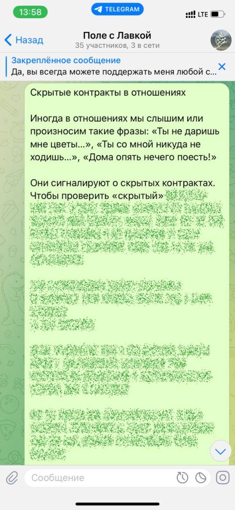 Приходите в закрытый чат «Поле с лавкой». Там много живого и полезного про взаимоотношения, работу и много другое.
