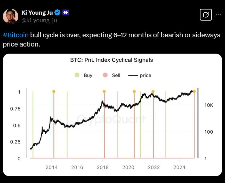 Ки Янг Джу опубликовал график PnL Index Cyclical Signals, который исторически точно предсказывал пики биткоин-рынка. По его мнению, биткоин завершил бычий цикл, и рынок может войти в фазу коррекции или бокового движения на 6–12 месяцев.
