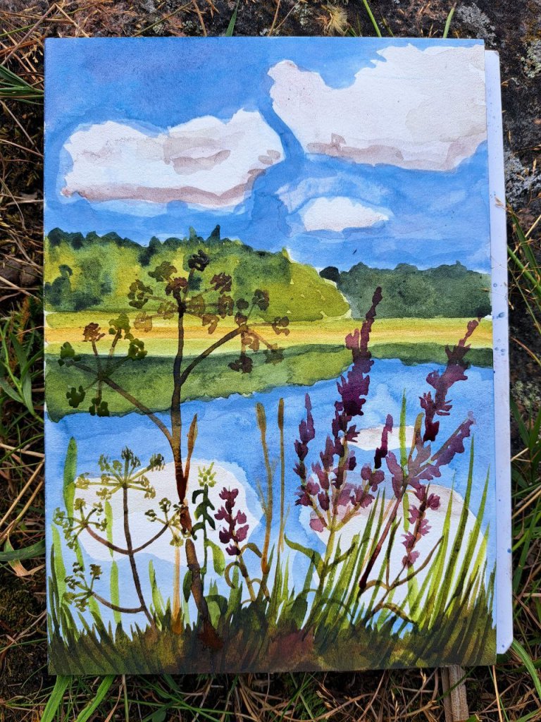 Видела один довольно крупный болид, не считая обычных пролётов, поела чернички, покупалась, поисследовала заброшенные финские дороги и хутора, нарисовала вот пейзажик🌿