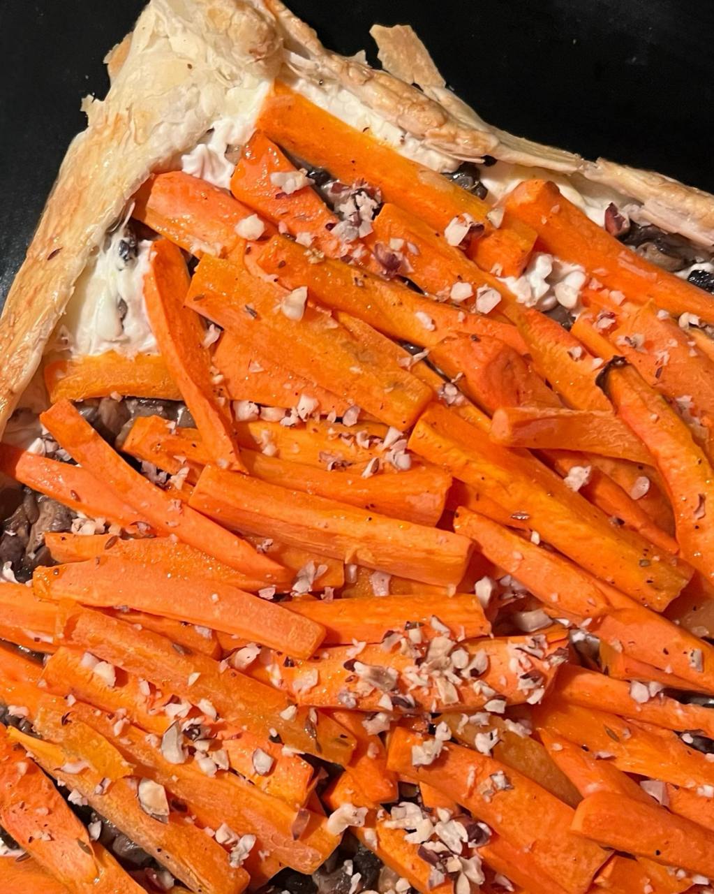 3. Слоёное тесто раскатайте в прямоугольник, потыкайте вилкой, чтобы тесто не вздувалось. Запекайте 10 минут параллельно с морковью.
