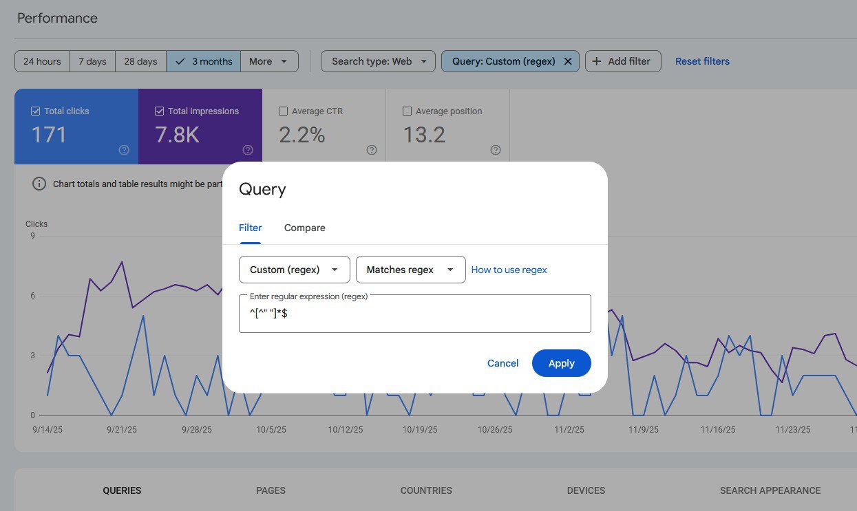 Чтобы сегментировать запросы GSC по разным сегментам можно использовать фильтры регулярных выражений RegEx.