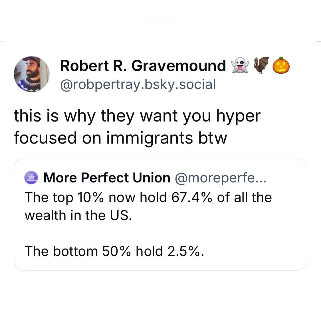 Кстати, вот почему они хотят, чтобы ты зацикливался на иммигрантах: «10% богатейших граждан владеют 67,4% всех богатств США. У 50% беднейших — всего 2,5%».