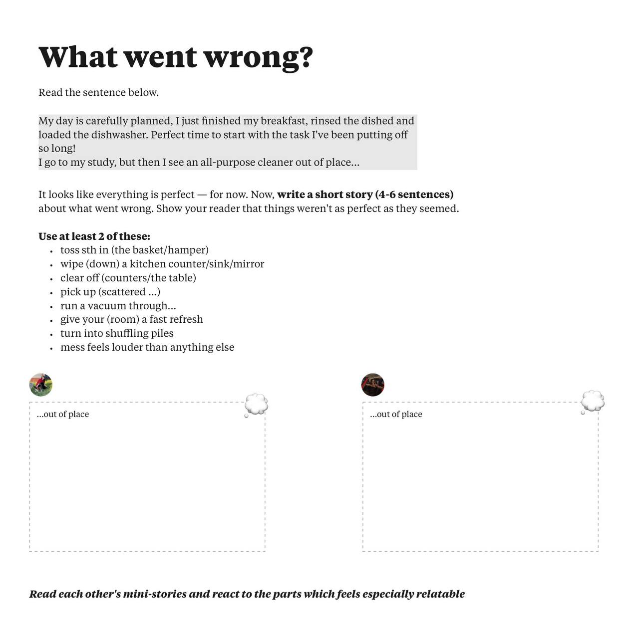 🩷Это супер-простая, но универсальная активность на микро-райтинг, которая называется “what went wrong?”