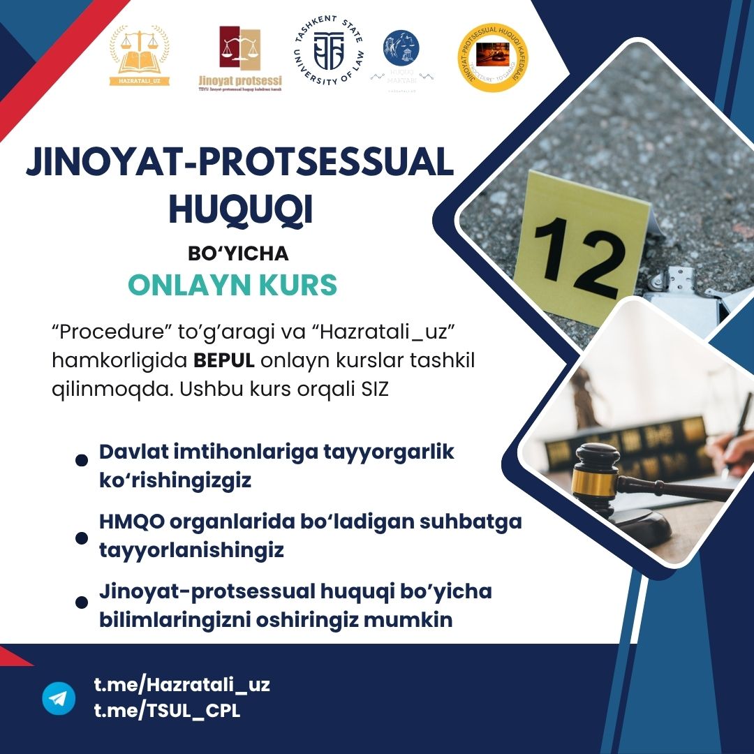 "Jinoyat-protsessual huquqi" bo'yicha onlayn kurs haqida ma'...