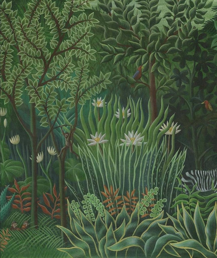 Живописная стена в стиле наив, джунгли, цветы, птицы и живот...