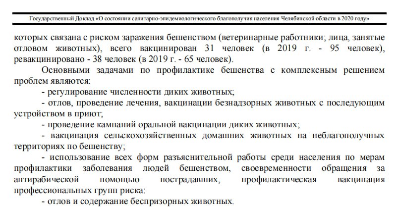 «Количество укусов животными в 2024 году в Челябинской области уменьшилось по сравнению с 2023 годом на 4 % и составило 8988 случаев против 9347 в 2023 г. Количество лиц, пострадавших от укусов, ослюнений безнадзорными животными (кошки+собаки) за 2024 год составило 3371 случай, в т.ч. количество детей до 17 лет, пострадавших от укусов безнадзорными животными (кошки+собаки) за 2024 год — 1062 случаев.»